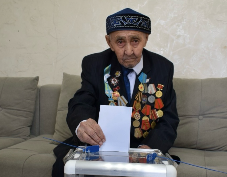 Жетісу облысы бойынша жалғыз көзі тірі майдангер, ғасыр жасаған Ысқақ Құсайынов өз таңдауын жасап, үйінде дауыс беріп, азаматтық борышын орындады.
